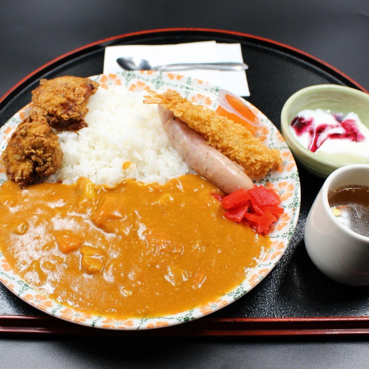 ご要望にお応えて、子供用の甘口カレーを大人の方も召し上がれるように致しました♪辛みの全く無い給食で食べたようなシンプルで懐かしいカレーです✨甘口カレーセット(杏仁豆腐・スープ付)唐揚げ2個+ソーセージ・海老フライがついて、小盛650円・中盛800円・大盛950円です。来週からスタート✨