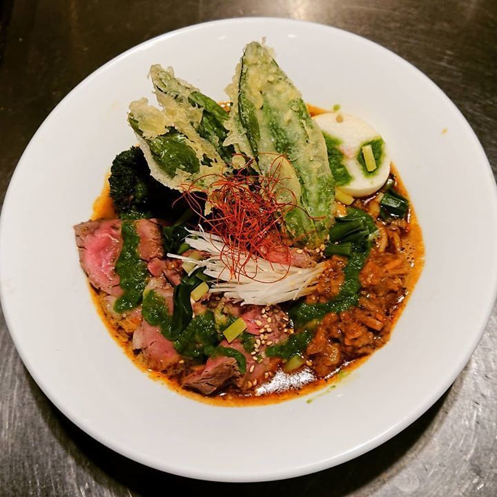 試作第2弾♫ジンギスカンに行者ニンニク入れる的なラーメンです(^_^;)生ラムタタキのスパイスラーメンに行者ニンニクの香りたっぷり✨行者ペーストは、醤油漬けに負けていらないですね💦パリパリの天婦羅が良いアクセントに(*^^)v具沢山過ぎて食べずらい位(゚Д゚;)納豆キーマとどっちがいいかなァ~?