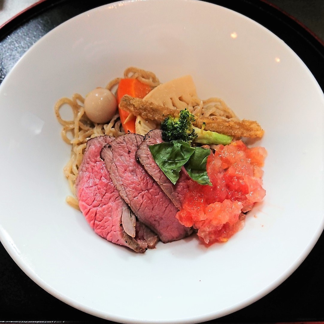 本日の試作🐄牛骨トマトスープのカレーつけ麺です🍅前回、好評だったつけ麺の第二弾🍜スープの粘度を1.5倍に上げて、菜々兵衛さんの中太平打ち麺に合わせました✨牛もものアッサリしたローストビーフが旨い🍖程よいトマトの酸味が濃厚なスープを和らげてくれます🎐来週予定してますのでお楽しみに♫