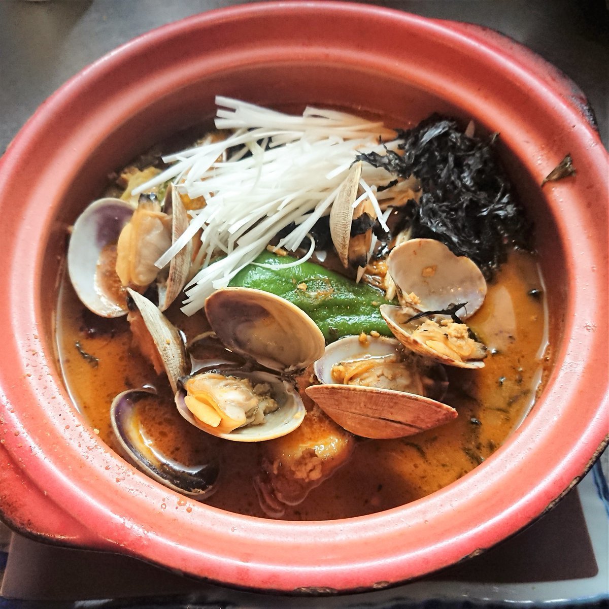 今日も試作✨アサリとひき肉のスープカレー♪酒蒸しのようにガーリックバターで炒めてからの煮干スープ。。。うーん、イマイチ(TOT)煮干の風味が強すぎて、アサリが負けてます(>_<)イメージと違い、色々な味が複雑になって、純粋なアサリの酒蒸しの方が美味しい(/ω\)これは、やり直しですね💦