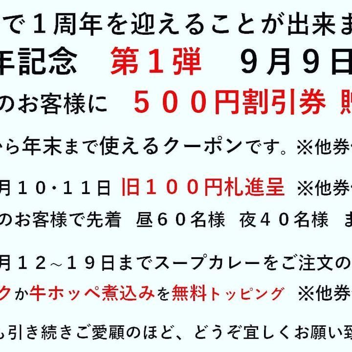 お陰様でもうすぐ1周年✨特にオープンから半年間は、満足のいくお料理をご提供出来なかったことを深く反省しております。その間、ご来店下さったお客様にはガッカリさせてしまったことを心よりお詫び申し上げます。これまで色々なことが御座いましたが、なんとか1年を迎えることが出来そうです🎵それも、フォロワー様のお力添えがあったからだとしみじみと感じてます。日頃の感謝の気持ちを込めまして、9月より1周年イベントを開催致します。フォロワー様には、7~9日の3日間ディナー限定でお食事をご注文のお客様にしゃば蔵キャップをプレゼント🧢※500円無料券不可。先着25個、サイズも御座いますのでお早めにどうぞ! #スープカレー #スパイスラーメン #スパイスカレー #しゃば蔵 #札幌スープカレー #スープカレー札幌