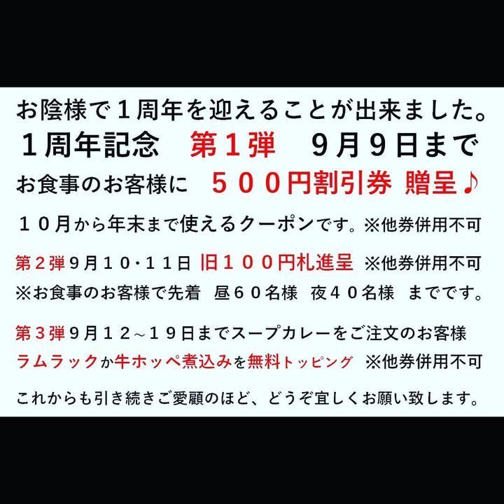 お陰様でもうすぐ1周年✨特にオープンから半年間は、満足のいくお料理をご提供出来なかったことを深く反省しております。その間、ご来店下さったお客様にはガッカリさせてしまったことを心よりお詫び申し上げます。これまで色々なことが御座いましたが、なんとか1年を迎えることが出来そうです♪それも、フォロワー様のお力添えがあったからだとしみじみと感じてます。日頃の感謝の気持ちを込めまして、9月より1周年イベントを開催致します。フォロワー様には、9月7~9日の3日間ディナー限定でしゃば蔵キャップをプレゼント🧢※キャップをお渡し出来た方には500円無料券不可。先着25個、サイズも御座いますのでお早めにどうぞお越し下さい(^^)/#スープカレー #スープカレー札幌 #札幌スープカレー #スパイスカレー #スパイスラーメン #しゃば蔵