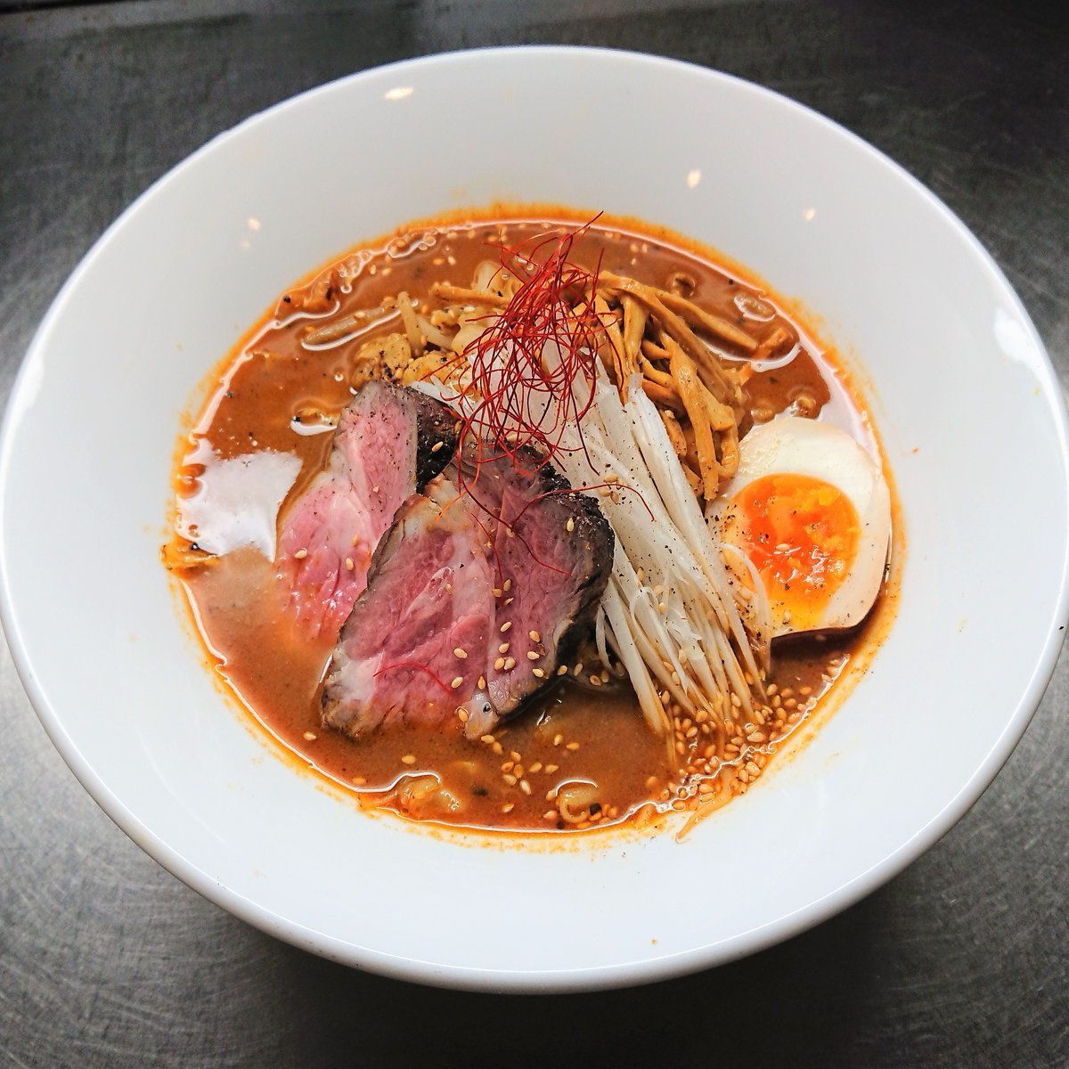今日の試作🎵羊骨スープの辛味噌ラーメン🍜味玉と生ラムを燻製にして、ご要望の多かったチヂレの玉子麺で今回は作ってみました✨でも、やっぱり玉子麺と焦がしニンニクで羊さんが鳴りを潜めてしまいます(^_^;)う~ん💦羊のひき肉を炒めて、より香ばしい羊の風味を出す事にします🐏💕お楽しみに~(^o^)