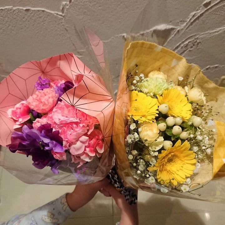 二人の娘の誕生日が近いので、今流行りの鬼滅の刃バージョンでプチブーケを作って頂きました💕禰豆子と善逸のカラーで娘達も大喜び🎉良心的なお値段で無理を聞いて下さったフラワー花水木 札幌エスタ店さん、本当に有難うございました✨丹次郎などもご要望に合わせてくれるそうですよ🎵皆様もお祝いの時に是非💐 #フラワー花水木エスタ店 #しゃば蔵 #きめつのやいば #鬼滅の刃
