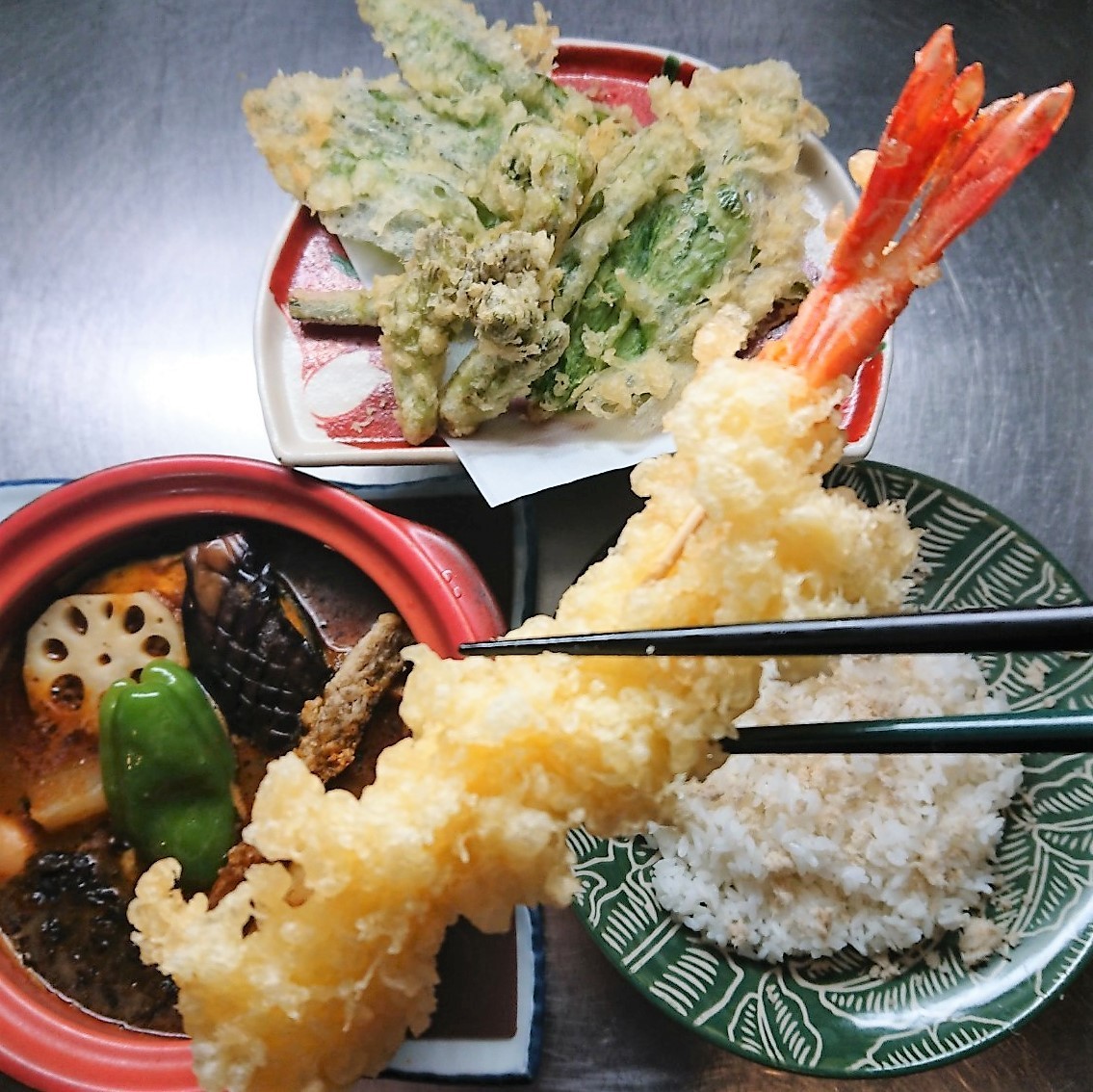 5月15日までの限定メニューは!旬の山菜天ぷらのスープカレー野菜9品¥1300です🌸煮干スープで行者ニンニク・タランボ・こごみなど春の香りをお楽しみ頂けます✨トッピングで大海老天ぷら特価¥300や山わさびの醤油漬け¥50も人気です🦐今回より終日、ご提供できるようになりました🎵続く…