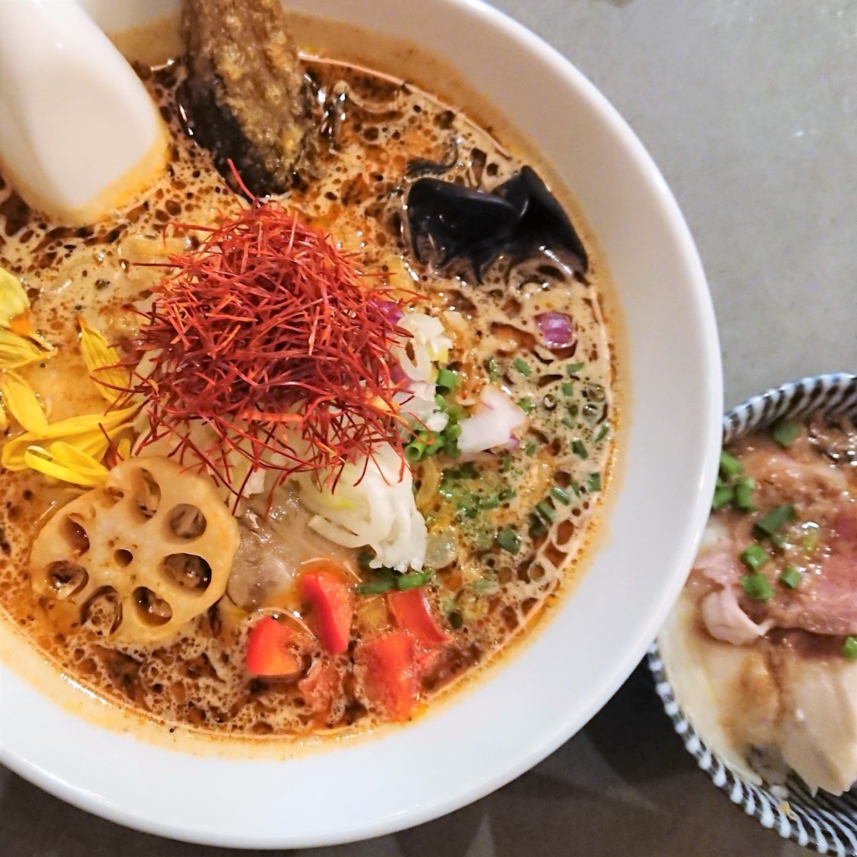 ずっと気になっていた点と線さんに行ってきました🎵辰二郎!う~ん魅かれるが、ここは定番のスパイスラーメンで🍜見た目も彩りが鮮やかですね🌈スープの色々と複雑な味わが口の中に広がります✨この甘くクリーミィーな余韻はココナッツなのでしょうか💦最後まで美味しく完食致しました💕ご馳走様です!