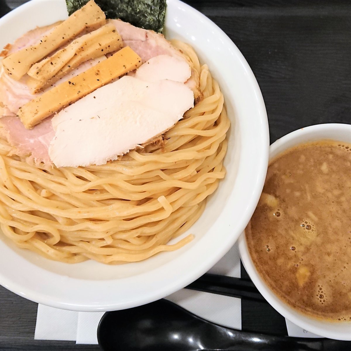 フォロアー様に濃厚つけ麺がオススメと聞いて、近所のHACHIさんに2度目の来店🎵なんと!感染防止にと青汁×抹茶のウエルカムドリンクのサービス✨大盛+100円はすっごい食べ応え🍜麺は中太の全粒粉入りでしょうか?しっかりとした歯ごたえで濃厚すっきりなスープと相性バッチリ💕ご馳走様でした(^o^)