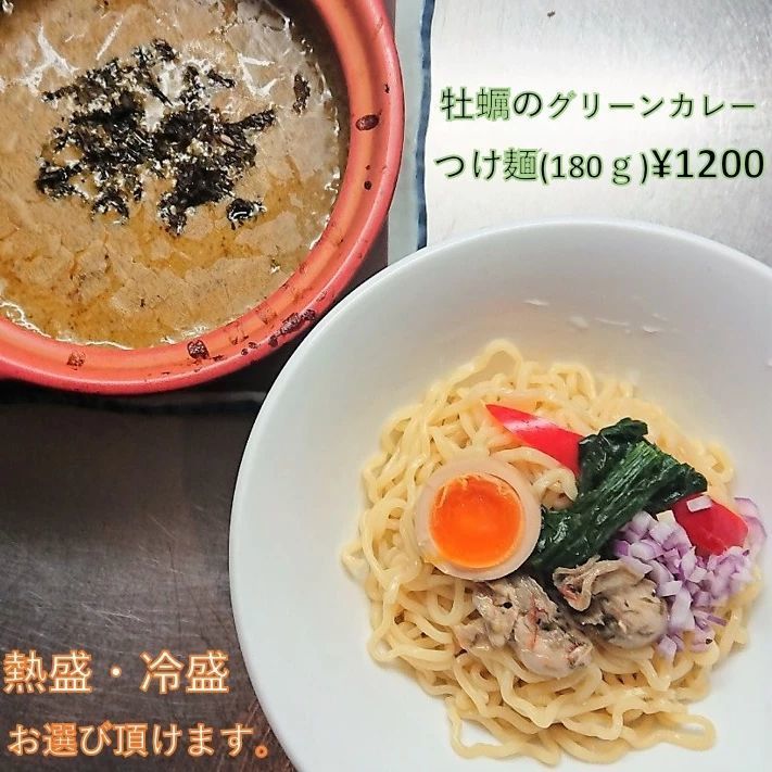 2月14日からの限定メニューは!牡蠣のグリーンカレーつけ麵1200円(茹で前麺180g)です🍜贅沢にも牡蠣をペースト状にして煮干ベースのスープと合わせました✨今回は、カネジン食品の中太ウエーブ麺を使用しておりますが、茹で時間がかかってしまうので、お急ぎのお客様はご遠慮下さい(>_<)
